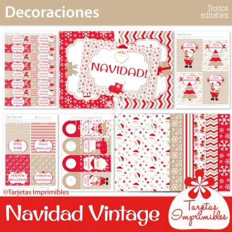 Decoraciones navideñas estilo vintage en color rojo y beige o tostado. Contienen textos editables y se imprimen en hojas tamaño A4. El tema navidad vintage contiene banderines, etiquetas para botellas, etiquetas para golosinas, etiquetas para bolsitas, cajitas para imprimir y armar, bolsitas para sorpresas. Tarjetas de felicitación o saludos, listas para editar e imprimir. Imágenes de Santa Claus o Papá Noel, estrellas, bota, y mucho más!
